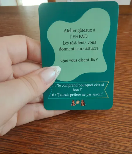 • Le principe : Un joueur, le médiateur, lit une anecdote réelle du quotidien (service à la personne, petite enfance) avec un élément manquant.