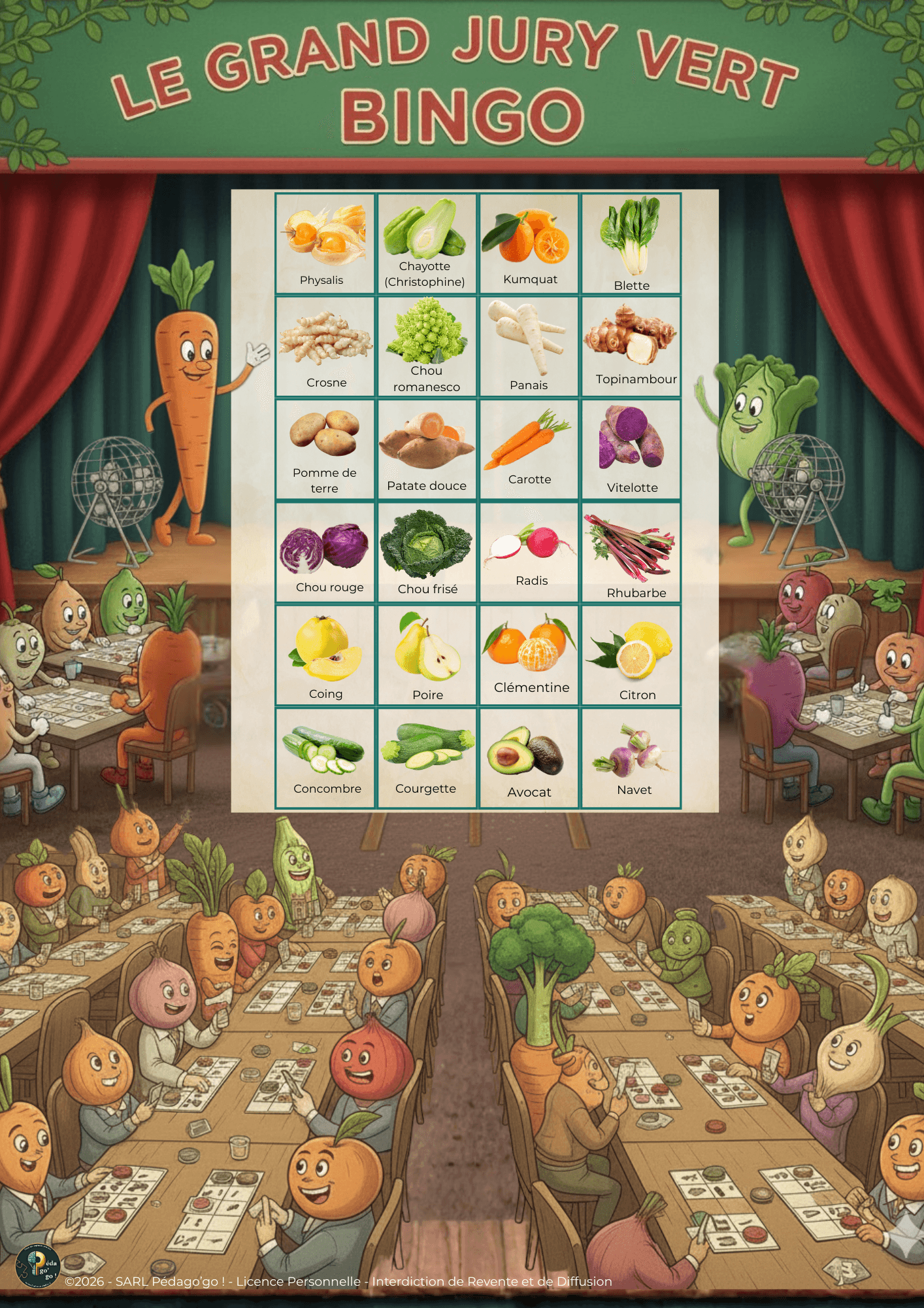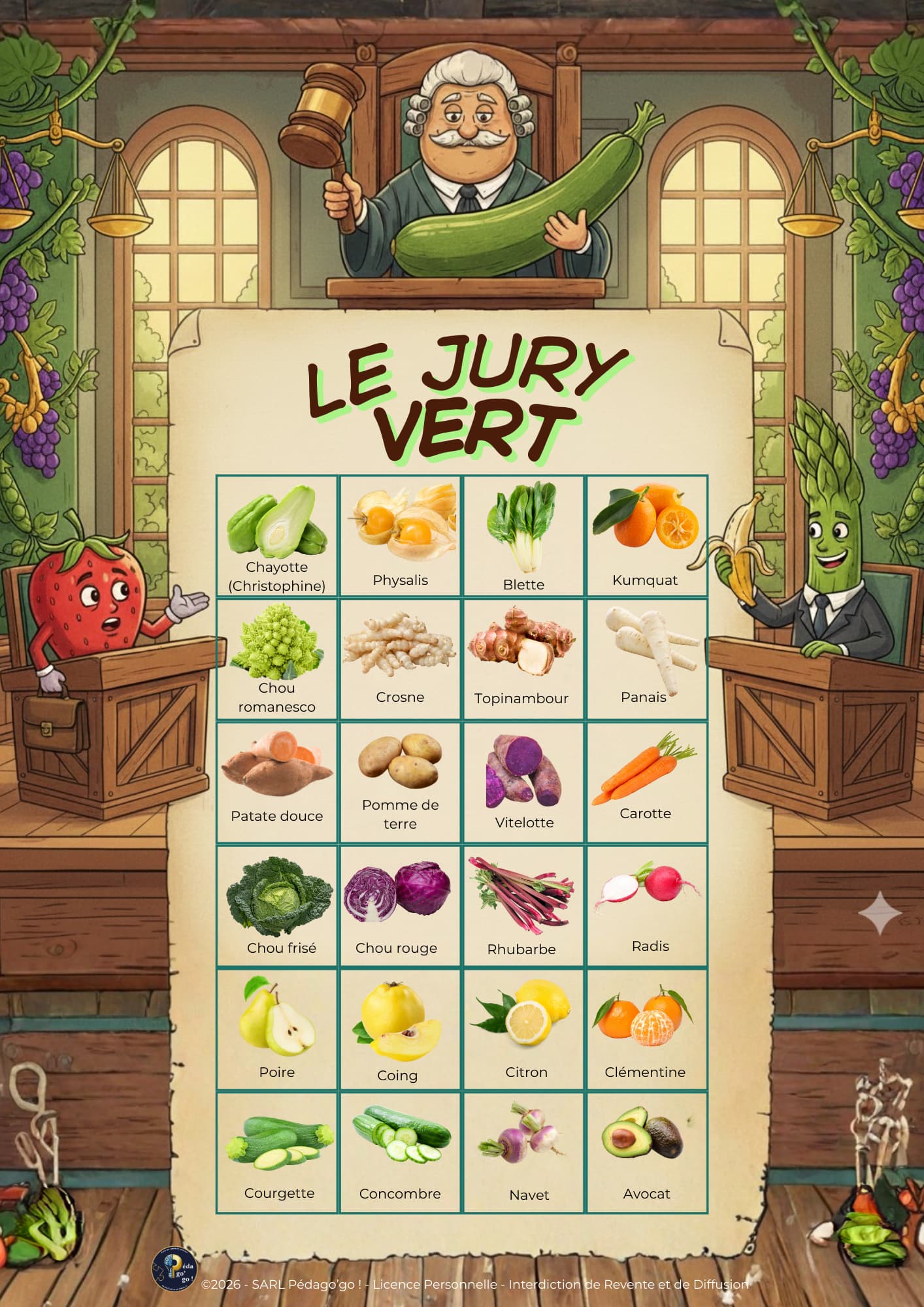 Le jury vert : un jeu 2-en-1 (Bingo et Qui-est-ce ?) pour explorer l’univers des fruits et légumes.