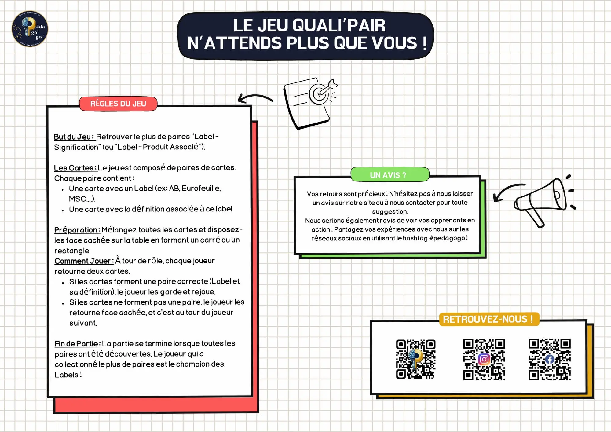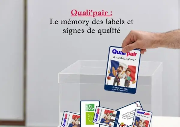 AOP, AOC, Label Rouge, Agriculture Biologique… Pas toujours facile de s’y retrouver ! « Quali’pair » est un jeu de mémory éducatif conçu pour apprendre à identifier les principaux labels de qualité et comprendre leur véritable signification.