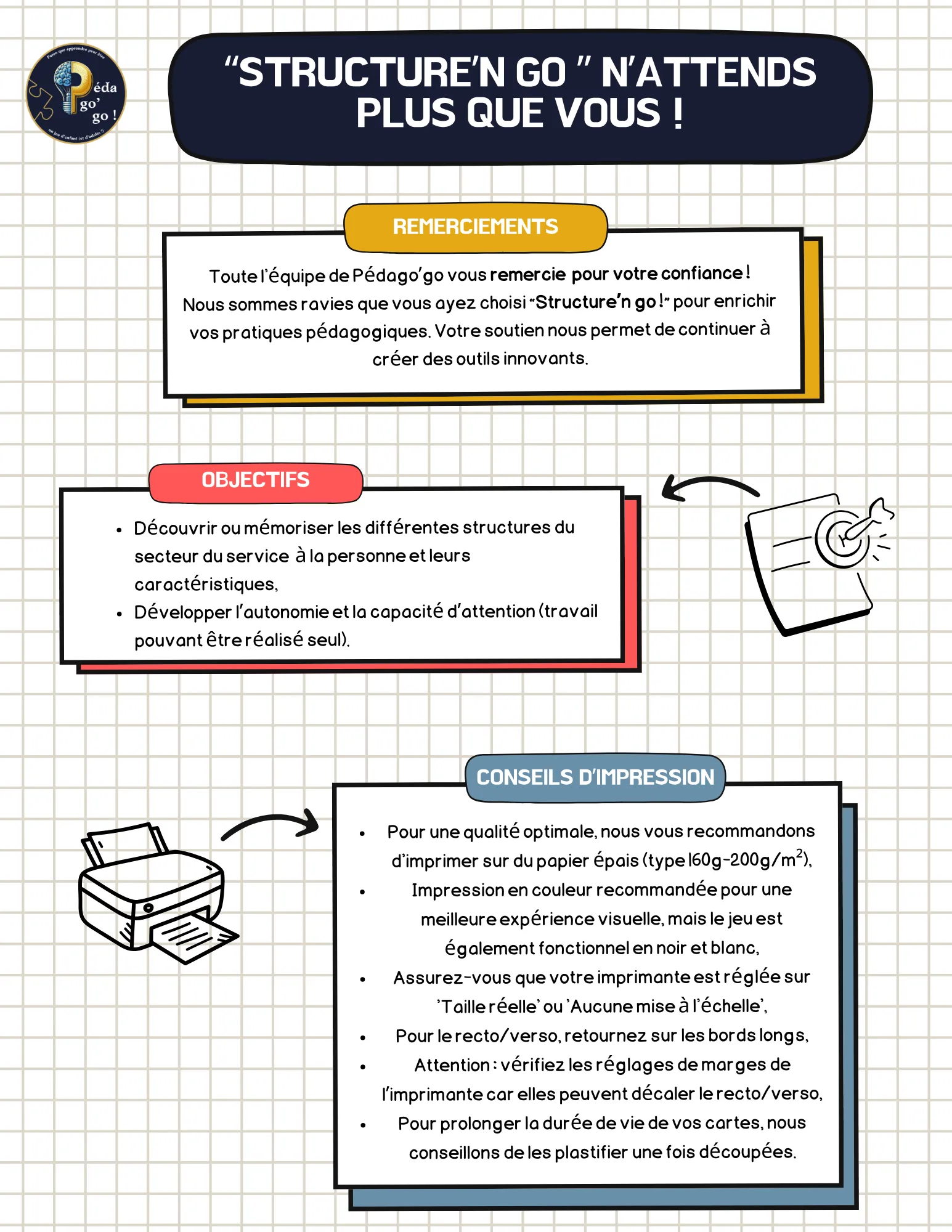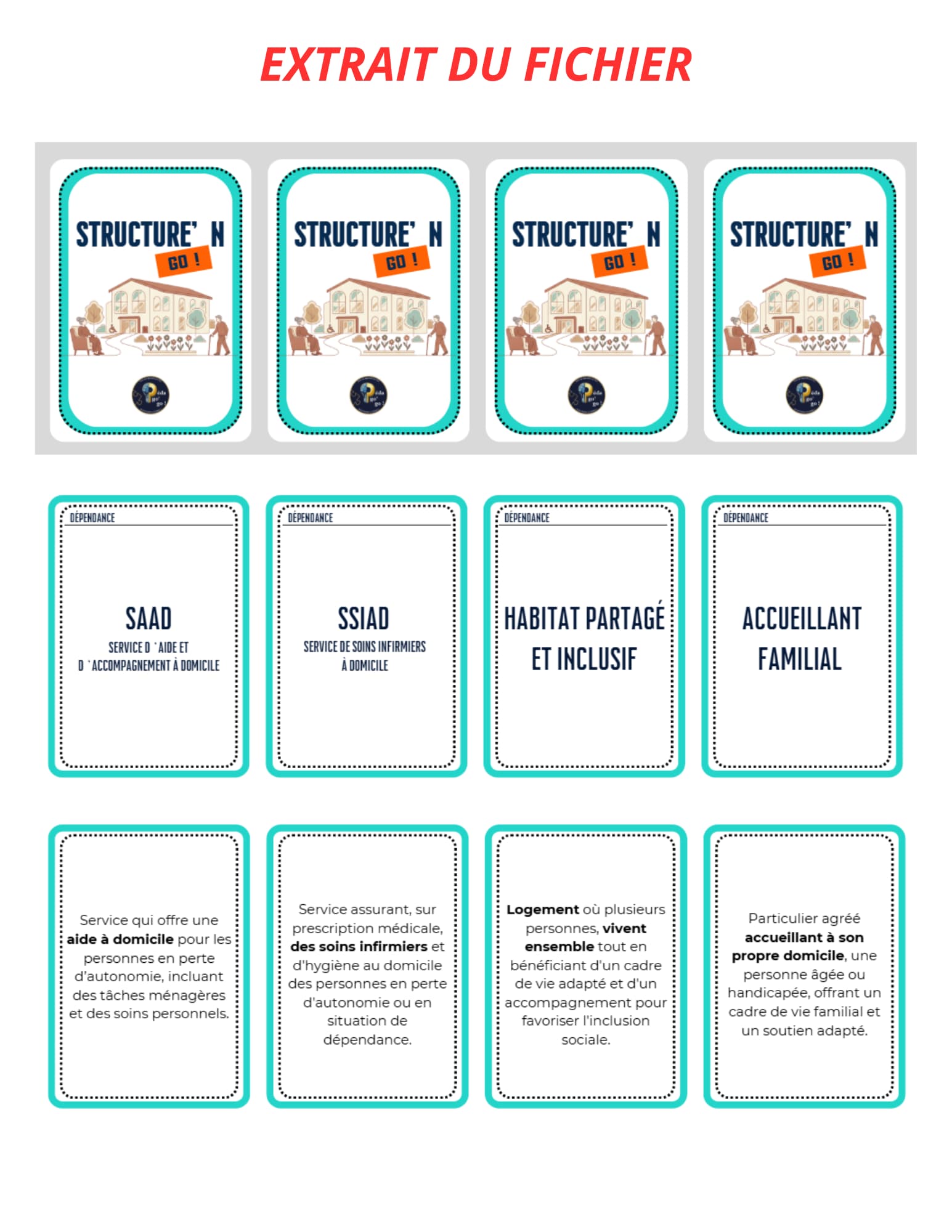 • Apprentissage ludique : Avec son format jeu de mémoire, Structure’n Go ! capte l’attention et rend l’acquisition des connaissances sur les structures du service à la personne interactive et efficace.