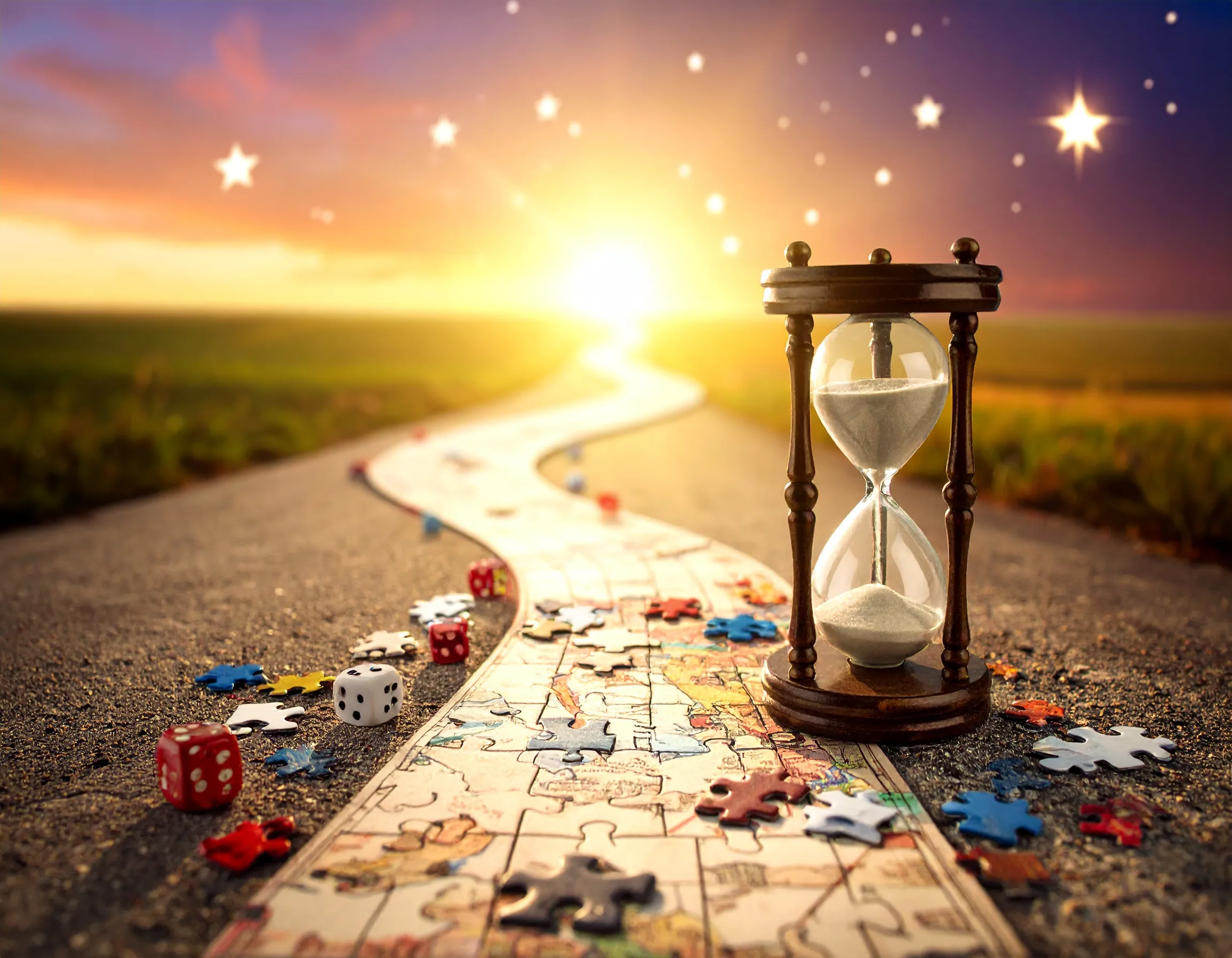 un chemin sinueux et gris se transforme en un chemin colore parseme de mini jeux